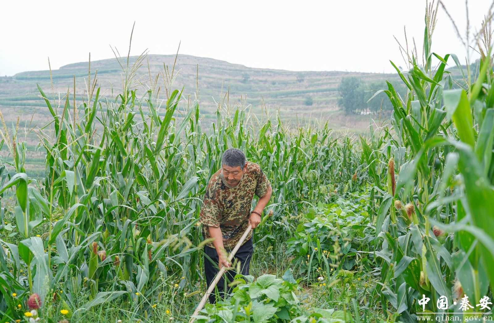 在魏店镇魏坡村大豆玉米带状复合种植基地里,嫩绿的玉米苗整齐排列、长势喜人,村民正在进行除草工作,一派繁忙的景象。