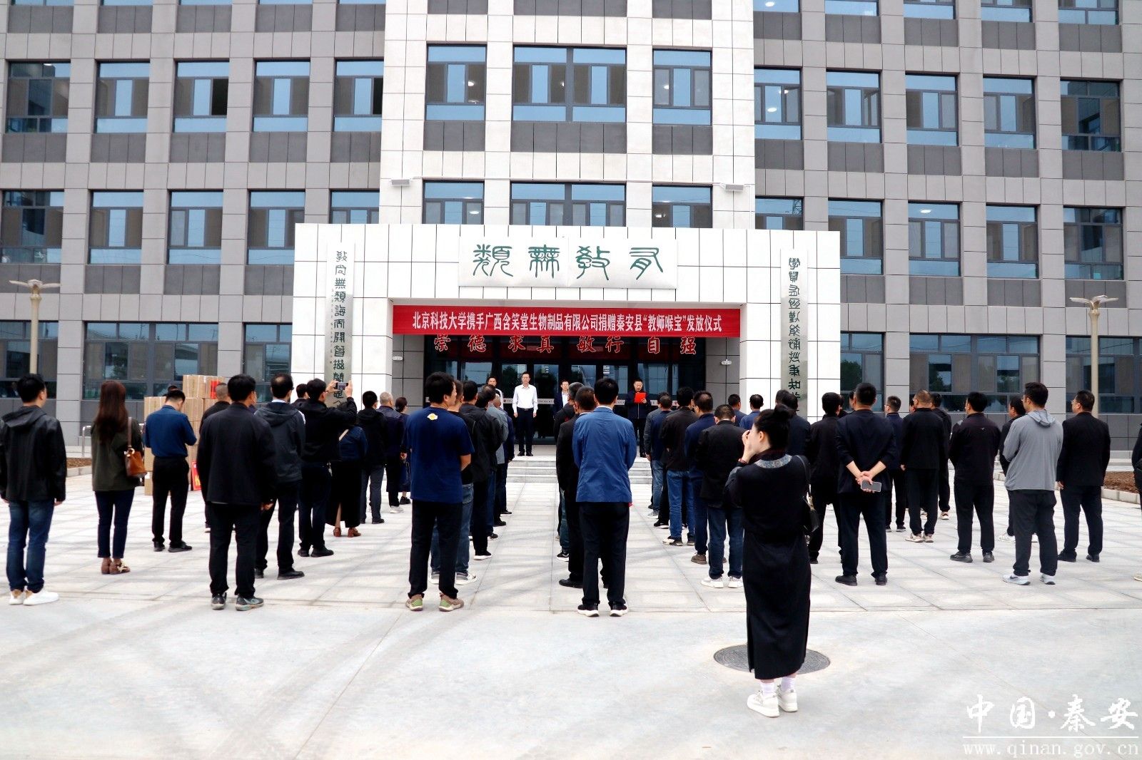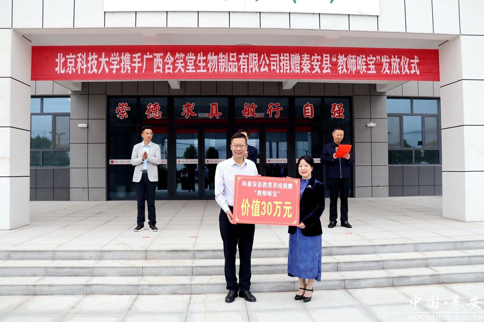 9月8日,北京科技大学携手爱心企业广西含笑堂生物制品有限公司在秦安县第六中学举办“教师喉宝”捐赠仪式。秦安县政府副县长张百年,广西含笑堂生物制品有限公司董事长(“刘三姐”品牌创始人)严丽梅,县教育局负责人及全县各学区校长、各局直学校分管政教工作的副校长共计70余人参加活动。