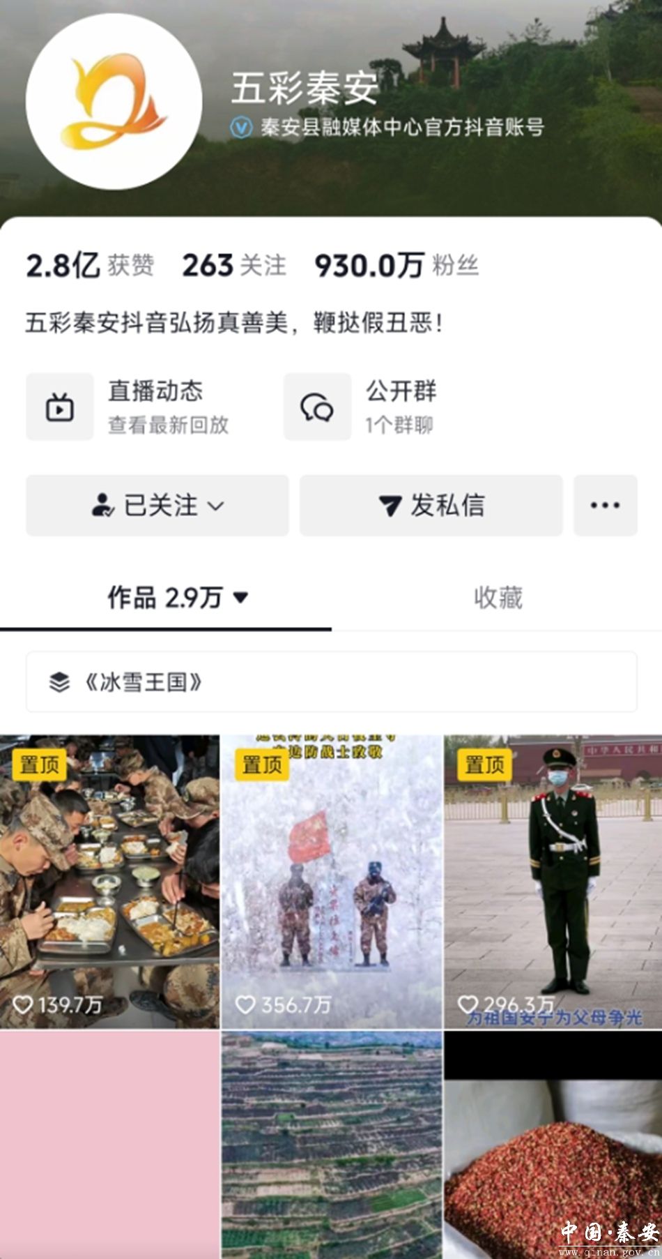 秦安融媒“五彩秦安”抖音号自2020年5月2日注册运营以来,至目前粉丝达到930万,共发布作品2.7万余条,获赞达2.8亿,创单条浏览量最高达9884万、单条点赞最高达360万、日增粉丝量最高达6.8万、单条浏览量上千万的作品达到2563条的良好纪录,在全省县级融媒体抖音平台中各项综合指数位居榜首,在全国县级融媒体抖音平台中粉丝数量位居第一,2022年、2023年、2024年“五彩秦安”抖音号连续三年被省委网信委评为“甘肃省十佳新媒体账号”,新华智云媒体大脑、新华网客户端和新华网大数据中心发布的全国县级融媒优秀榜单中,多次位居第二。