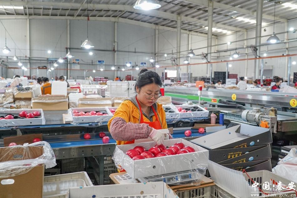 车间的繁忙,直接转化为了家门口的就业岗位。在精品包装线上,数百名工人正熟练地为苹果进行套网、贴标、装箱,他们绝大多数都是来自周边乡镇的村民,苹果产业的兴旺,让他们实现了“挣钱顾家两不误”。