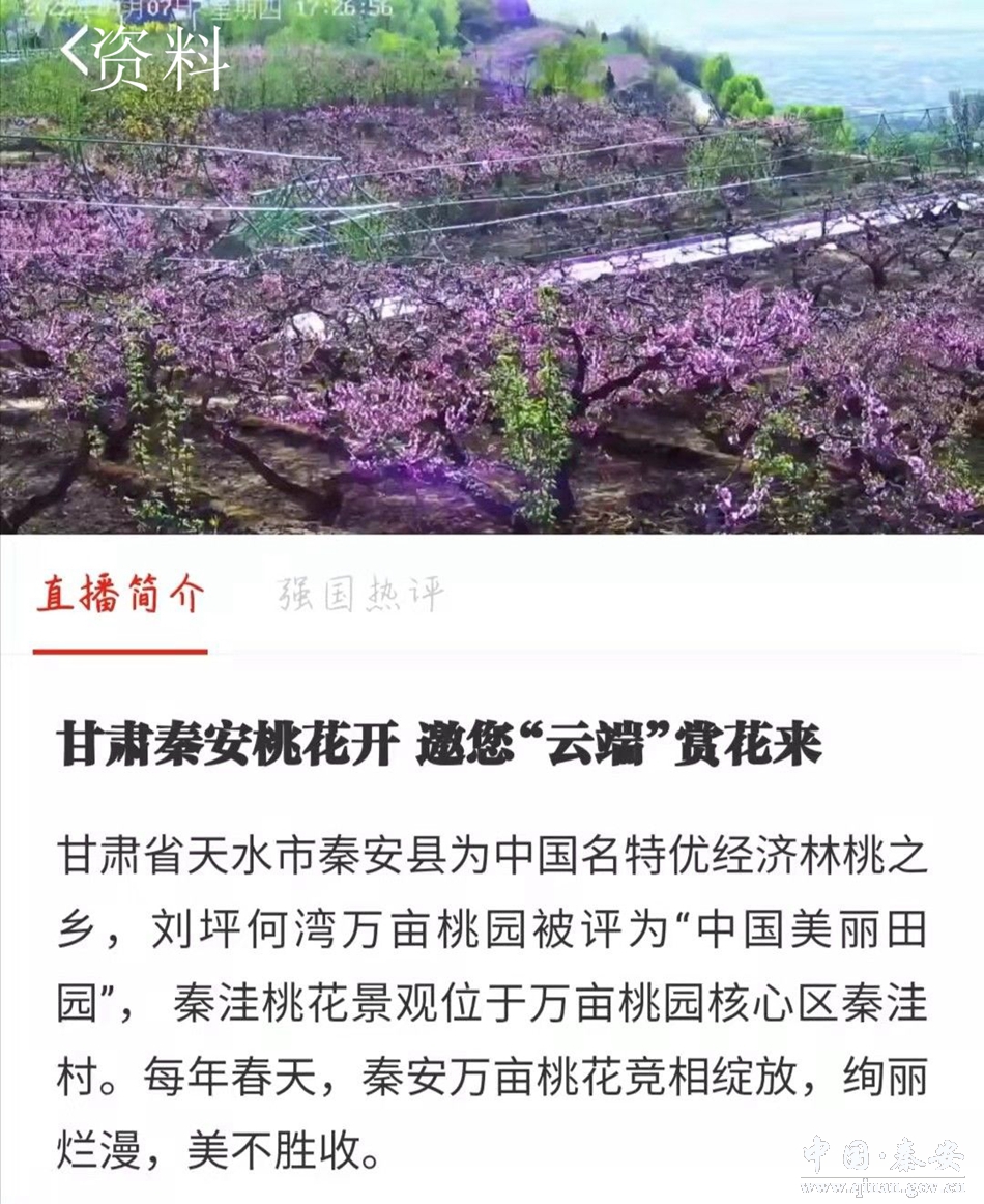 ①在学习强国平台开通“秦安桃花开”慢直播,利用“码上游秦安”微信小程序加大对秦安乡村旅游和桃产业的对外宣传。②在刘坪镇周湾、秦洼村,西川镇李堡、兴国镇花篅子桃园主景区,依托中国电信5G传输技术及平台,搭建实时高清摄像头,24小时“云守候”直播甘肃秦安桃花开,吸引广大网民通过“云赏花”,领略秦安万亩桃园灿如云霞的美丽景观。时间:2023年3月下旬—4月下旬。