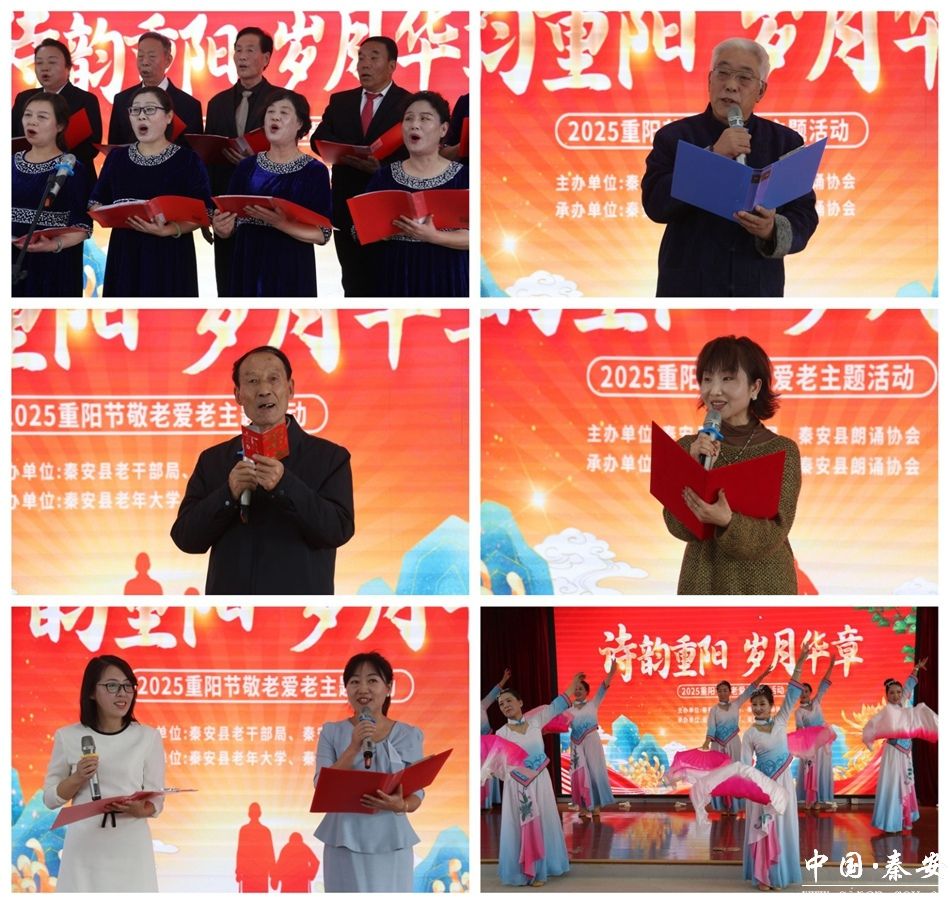 随后,精彩节目轮番上演,为现场观众呈现了一场视听盛宴。合唱节目《我唱赞歌献祖国》率先登场,老年大学合唱团的成员们用嘹亮的歌声歌颂祖国的繁荣昌盛,台下不时响起阵阵掌声。《秦安重阳念》《尊严的老去》《九月初九我拾起一枚乡愁》等朗诵节目作为此次演出的 “重头戏”,充分展现了语言艺术的魅力。细腻的文字、深情的演绎,让现场氛围愈发温馨。而陈氏太极拳表演更是为演出增添了一抹独特的风采。表演者们动作舒展流畅、刚柔并济,将中华传统武术的韵味展现得淋漓尽致,赢得了观众们的连连称赞。