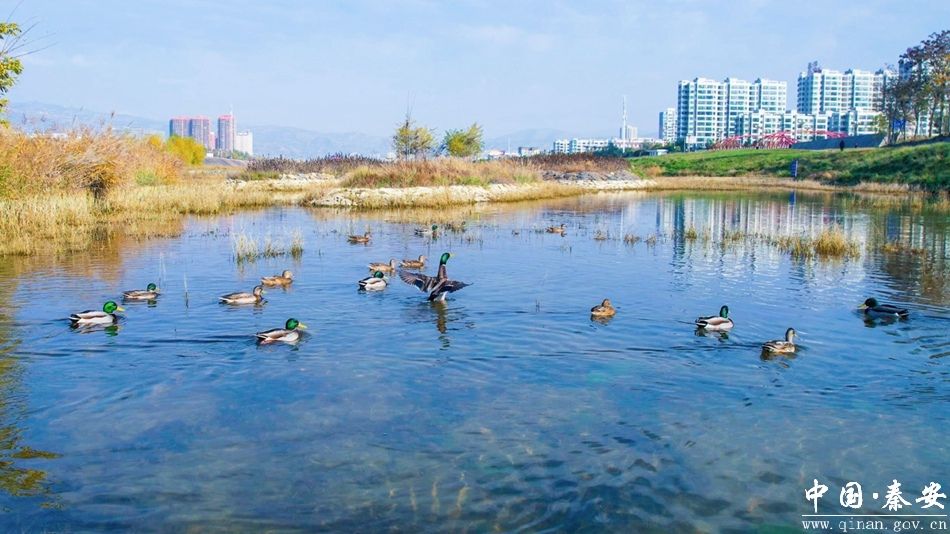 绿头鸭的“青睐”,源于秦安县对葫芦河流域的系统性生态治理。“十四五”以来,秦安县坚定践行“绿水青山就是金山银山”发展理念,以葫芦河生态修复工程为抓手,将生态治理与城市景观建设、人居环境改善深度融合。一方面,聚焦水质提升,建成26.37公里城镇污水管网,从源头切断污染物排放,确保葫芦河水质稳定达标;另一方面,实施河道疏浚、生态护岸建设、陆域生态缓冲带修复等项目,新增护岸9.28千米,修复湿地307.49亩,同步打造人工湖、木栈道、绿化长廊等景观设施,既提升了河流自净能力与水源涵养功能,又构建了“亲水近水”的城市生态空间,让葫芦河实现“水清岸绿”的蜕变。