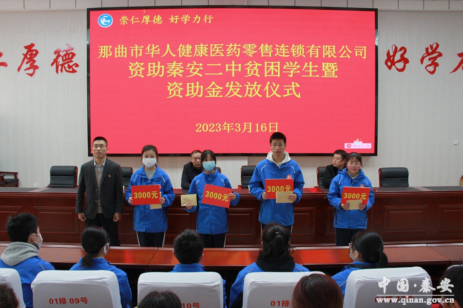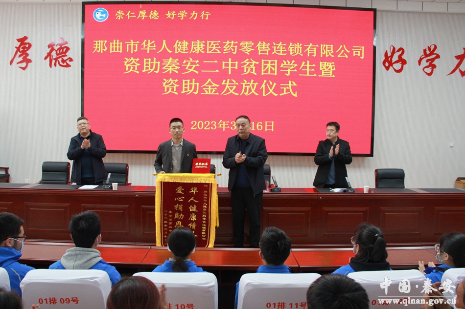 爱心助学行善举,情系学子暖人心。3月16日,那曲市华人健康医药零售连锁有限公司向秦安二中特困学生捐赠3.2万元。