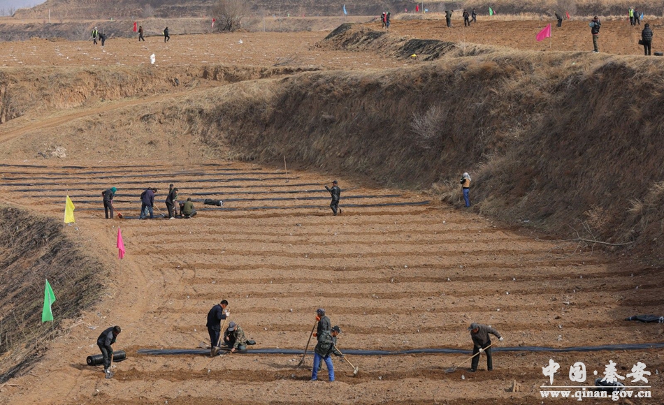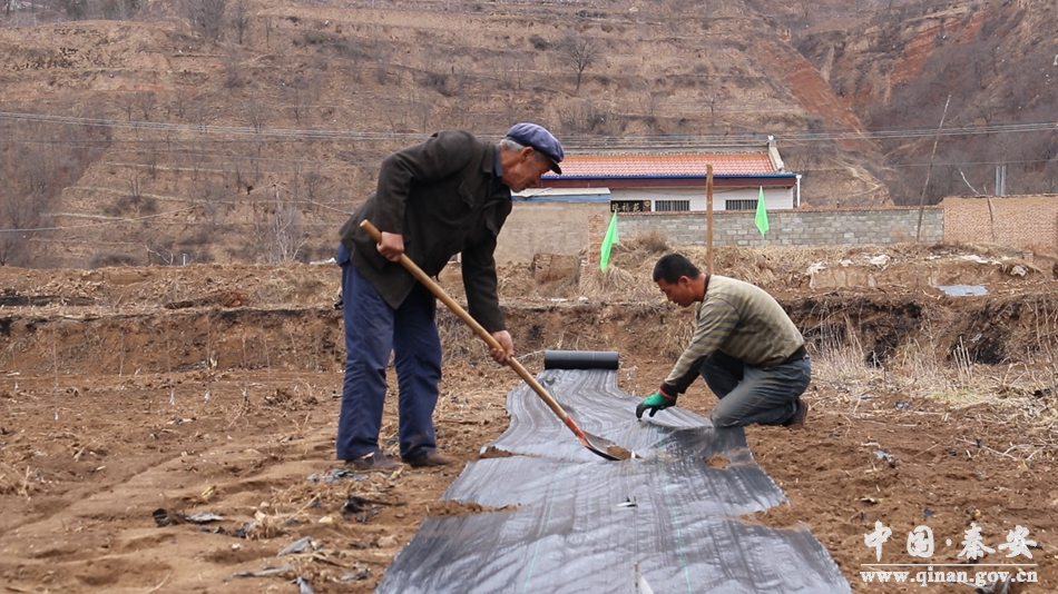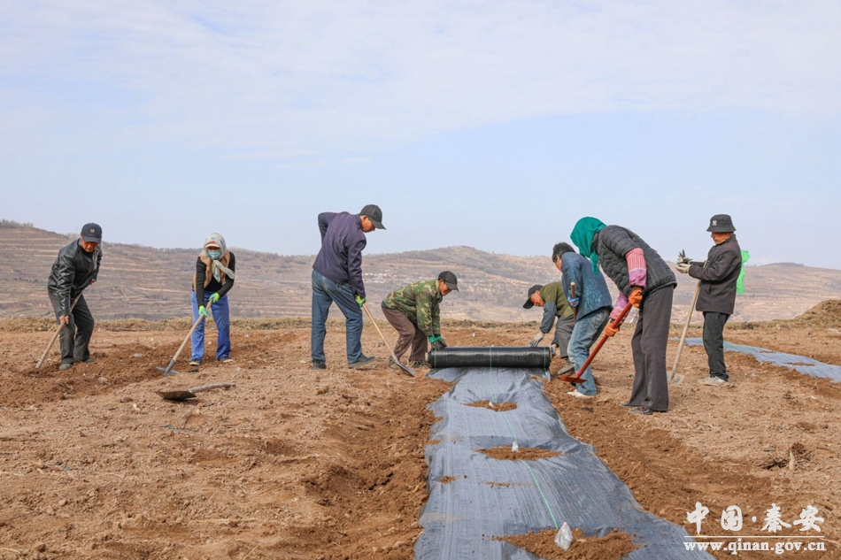 在魏店镇陈庄村老旧果园改造现场,果农们正在加紧时间忙着抢墒铺地布。魏店镇陈庄村村委会副主任宋小贤告诉记者,“陈庄村今年实施老果园改造700亩,我们从3月份开始前期准备,挖掉了老旧苹果树,栽植桃树,主要栽植北京七号。”