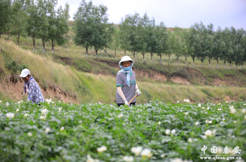 走进王铺镇万亩马铃薯种植基地,集中连片的马铃薯枝苗一眼望不到边,紫色、白色的马铃薯花铺展在田野上争奇斗艳,村民们正在田间进行除草翻土、病虫害防治等日常管护工作,基地种植的马铃薯品种主要是“陇薯7号”“青薯9号”、大西洋和费乌瑞它。