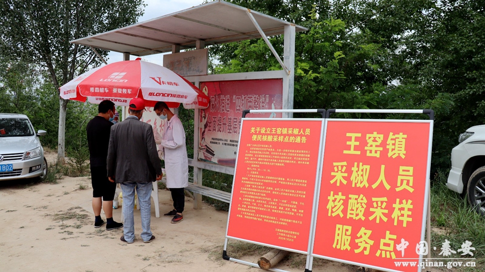 王窑镇作为远近闻名的花椒之乡,镇党委、镇政府积极作为,在王窑镇乔庙村、堡子村、罐岭村增设外来采椒人员便民核酸采样点,确保疫情防控花椒采收两不误。便民核酸采样点自7月20日设立以来,按照谁用工谁负责的原则,由用工农户组织采椒人员前往便民核酸采样点及时采样。为采椒工提供了便捷的采样渠道,确保疫情防控措施落地见效,保证了花椒如期采收,让疫情防控和农民增收致富两不误。为推动花椒采摘顺利进行,王窑镇党委、政府从严从实从细落实全市“三严七强化”防控措施,每村设置疫情防控服务点1个,督促各村做好椒客‘闭环’接送工作,坚决把疫情输入通道堵住,为花椒采摘提供安全工作环境。