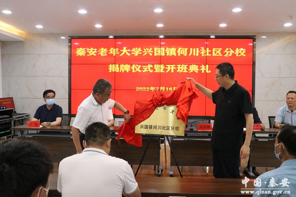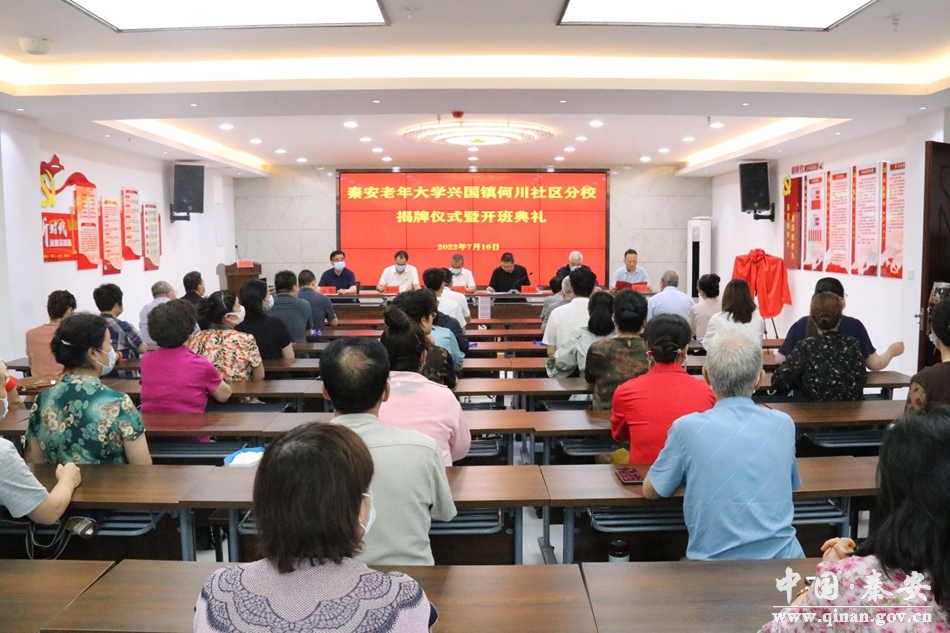 为了深入贯彻落实《中共中央、国务院关于加强新时代老龄工作的意见》精神,实施积极应对人口老龄化国家战略,充分利用各类有效社会资源,扩大老年教育规模,提升全县老年教育和老年人精神文化养老水平,7月16日,秦安老年大学兴国镇何川社区分校在兴国镇何川社区正式揭牌开班。秦安县委副书记、秦安老年大学校长姚建国,县委常委、组织部部长、秦安老年大学副校长许祖熙,县委常委、兴国镇党委书记董文海及校务委员会成员,老年大学专兼职教师、学员代表等40余人参加活动。