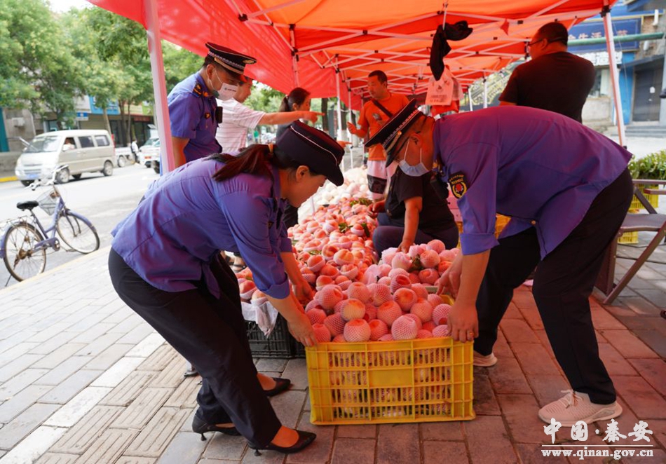 眼下正是秦安蜜桃上市的季节,为维护广大果农的切身利益,秦安县执法局按照“以人为本 规范管理”的原则,在街泉街、解放路、太白街等五处路段,设立果品临时交易点,既规范有序经营,又方便群众。
