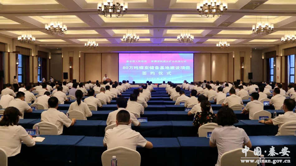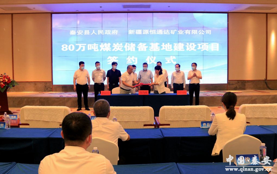 7月12日,秦安县人民政府与新疆源恒通达矿业有限公司80万吨煤炭储备基地建设项目签约仪式在大地湾印象酒店举行。甘肃省陇能煤炭物流有限公司董事长沈淳清,甘肃省陇能煤炭物流有限公司商务贸易部主任贠发龙,乌鲁木齐秦安商会会长、新疆源恒通达矿业有限公司董事长王晓春,乌鲁木齐秦安商会执行会长、新疆源恒通达矿业有限公司总经理李登科,新疆甘肃企业联合会常务副会长、新疆众合鑫茂建材有限公司董事长任继鹏,乌鲁木齐秦安商会执行会长、新疆成纪国际贸易有限公司董事长庞伟民,秦安县委书记周济,县委副书记、县长王龙强,县人大常委会主任李宽余,县政协主席杨喜春以及县四大组织全体在家领导和各镇党委书记,县直各部门、驻秦各单位主要负责人共计120余人参加签约仪式。