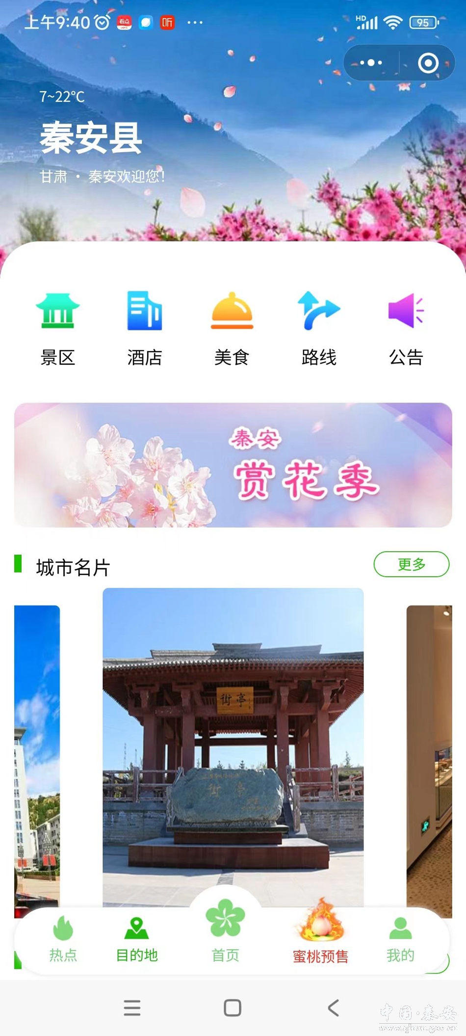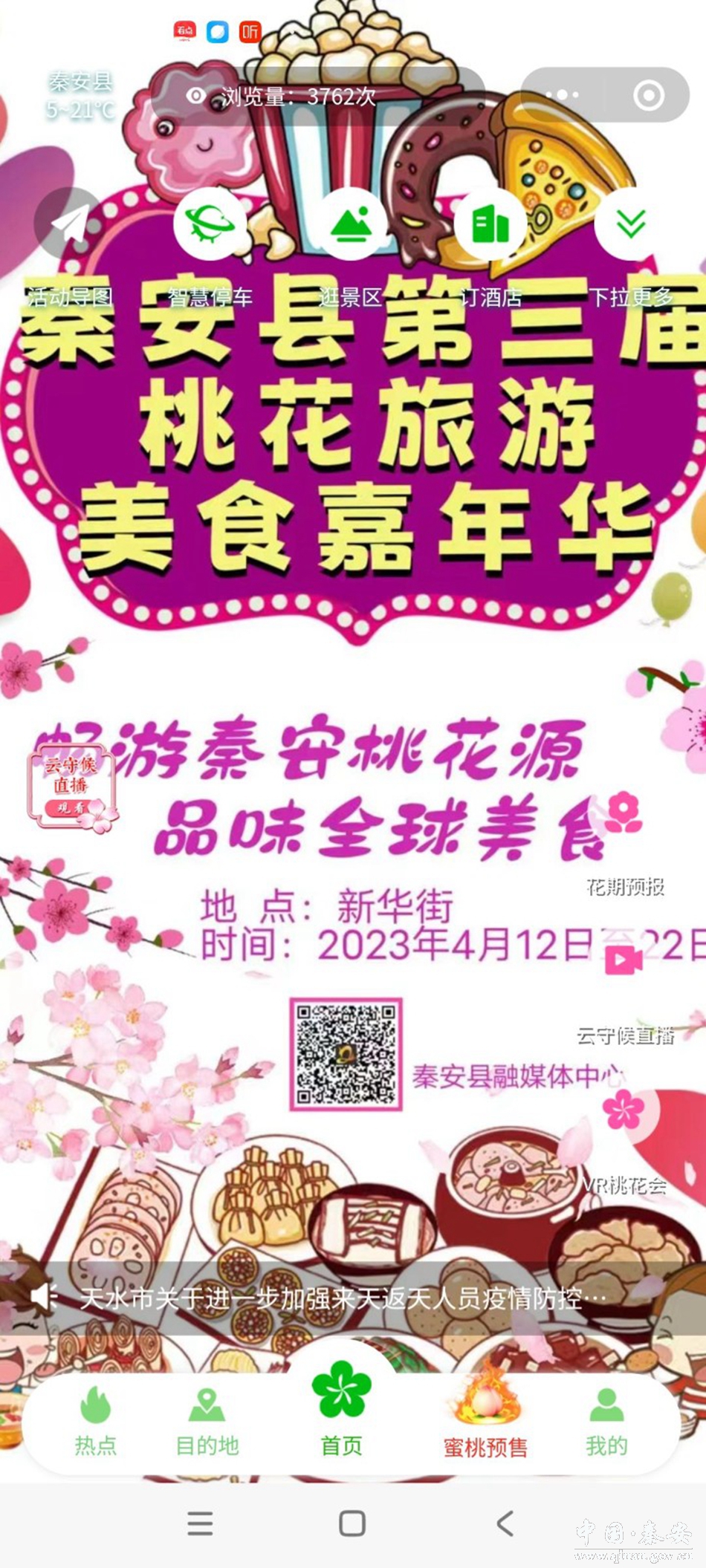 微信扫码“码上游秦安”二维码进入后,广大网友和游客可全面了解本届桃花会各项精彩活动、游览路线和秦安各处名胜古迹等,并且可直接下单预售秦安蜜桃和其它名特优产品。也可以通过云守候慢直播欣赏桃花美景,观看桃花花开花落的过程。