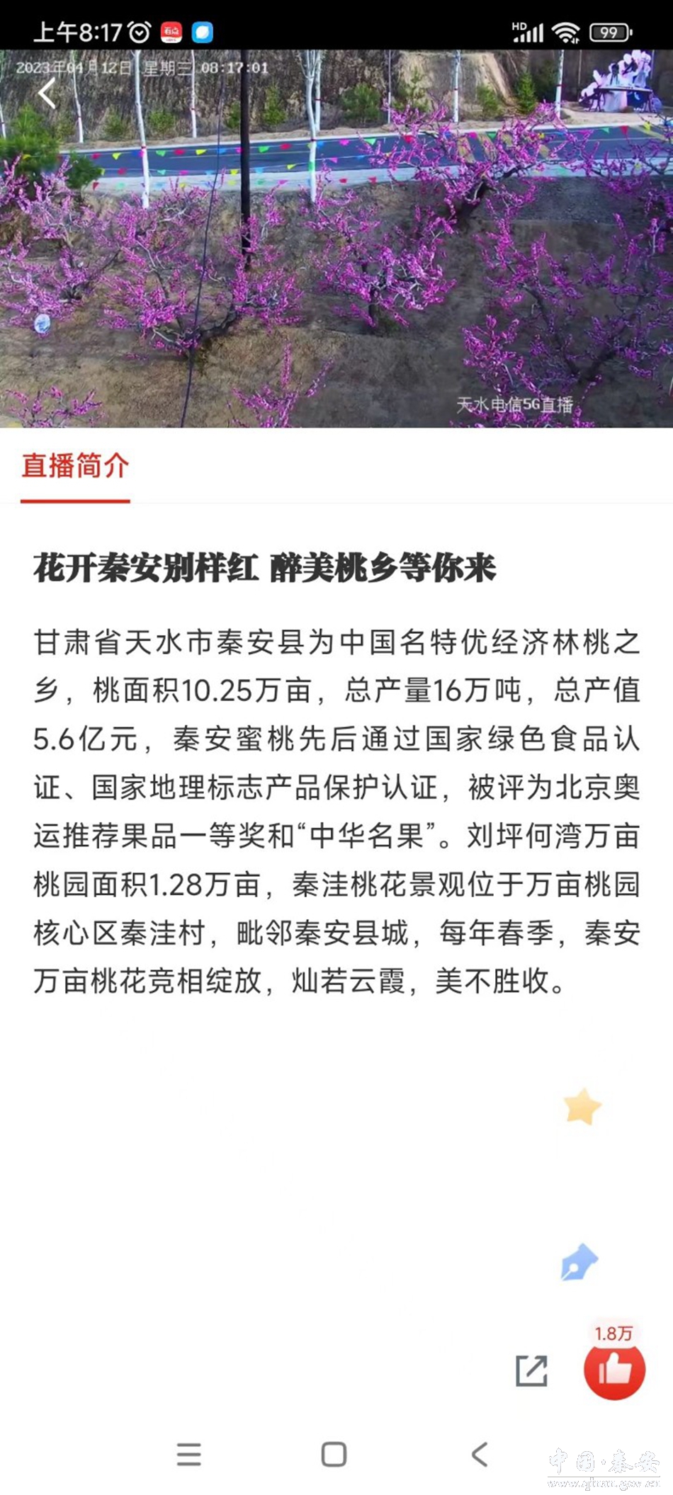 近年来,秦安县加快文化旅游产业融合发展,以乡村振兴为切入点,打造具有地方特色的“乡村旅游”品牌,推动全县旅游业向纵深发展。此次直播活动以花为媒,在刘坪镇周湾、秦洼村等桃园主景区,搭建实时高清摄像头,24小时“云守候”直播桃花,让广大网民通过“云赏花”,领略秦安万亩桃园灿如云霞的美丽景观,全方位展现桃乡振兴、农旅融合发展的“蝶变”之美,进一步提升了秦安的知名度和美誉度。