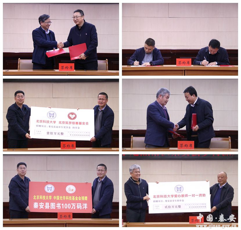 在随后召开的推进会上,陈雪松汇报了定点帮扶工作开展情况;新任挂职县政府副县长景鹏作了发言;车晓珍介绍了招商引资情况;同时,北京科技大学与秦安县签订了北科大二级党委和秦安县镇党委、双方团委共建、后勤集团采购框架、工会采购框架等协议;并举行了100万元高中生奖学金、助学金捐赠、价值100万元图书捐赠、爱心教师资助困难学生捐赠仪式。