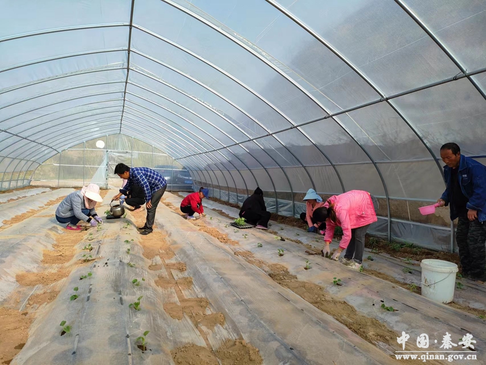 在种植基地,技术人员根据棚内温度情况,科学安排大棚栽植顺序,全程指导栽植工作,种植能手和党员干部群众热情高涨,分发转运秧苗、定株距、栽植各项工作有条不紊,种植大户及时为新栽植的白脆瓜秧苗浇水,确保移栽一株,成活一株。