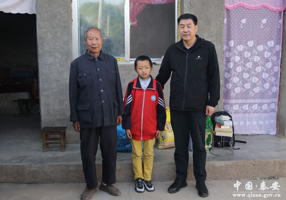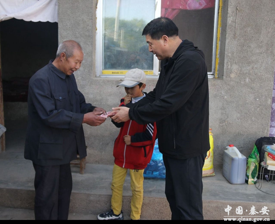 5月23日,省林草局副局长刘天波到秦安县中山镇孙赵村看望慰问帮扶孤儿王轶,为他送去了慰问金和生活、学习用品。秦安县委副书记蔡鹏云一同慰问。