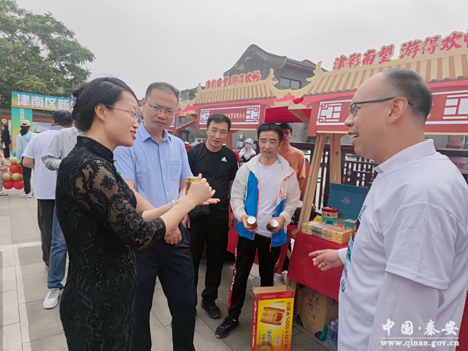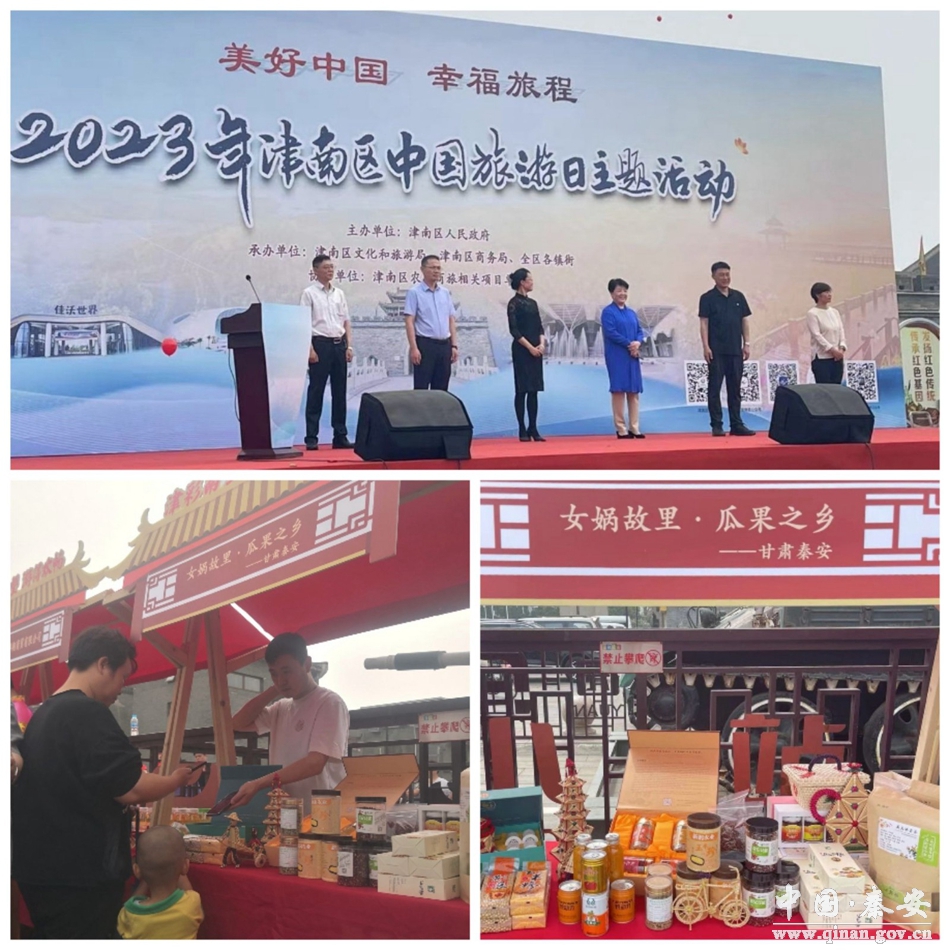 为了助力全县文旅农康融合发展,助推经济社会高质量发展,加快推进乡村振兴步伐,2023年5月19日,秦安县政协副主席、津南区商务局副局长(挂职)王建锋会同秦安县赴津南区挂职干部、跟班实训干部,再度携手津南区对口帮扶甘肃·秦安农特产展销中心,精心组织一批农特和文创产品,主动融入“美好中国幸福旅程”2023年津南区中国旅游日主题活动,奔赴久负盛名的“近代中国看天津”小站练兵园,参加对口帮扶商品展销活动,为旅游日主题活动增色添彩。
