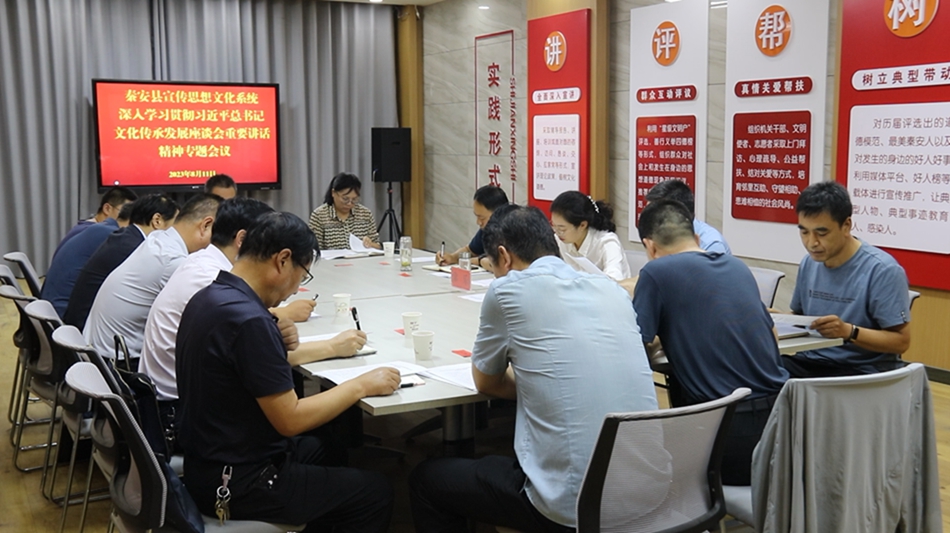 8月11日,秦安县宣传思想文化战线召开深入学习贯彻习近平总书记文化传承发展座谈会重要讲话精神专题会议,县委常委、宣传部部长常乐,县网信办、县文明办、县文旅局、县文联等相关部门负责人参加会议。