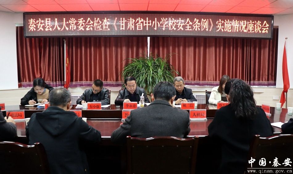 在随后召开的座谈会中,县教育局汇报了贯彻实施《甘肃省中小学校安全条例》情况,县人社局、公安局、司法局等进行了发言,并提出了有针对性的意见建议。