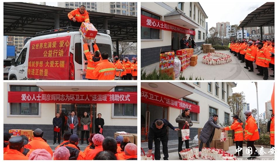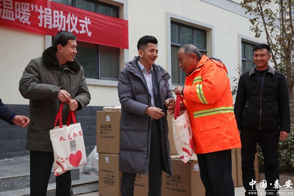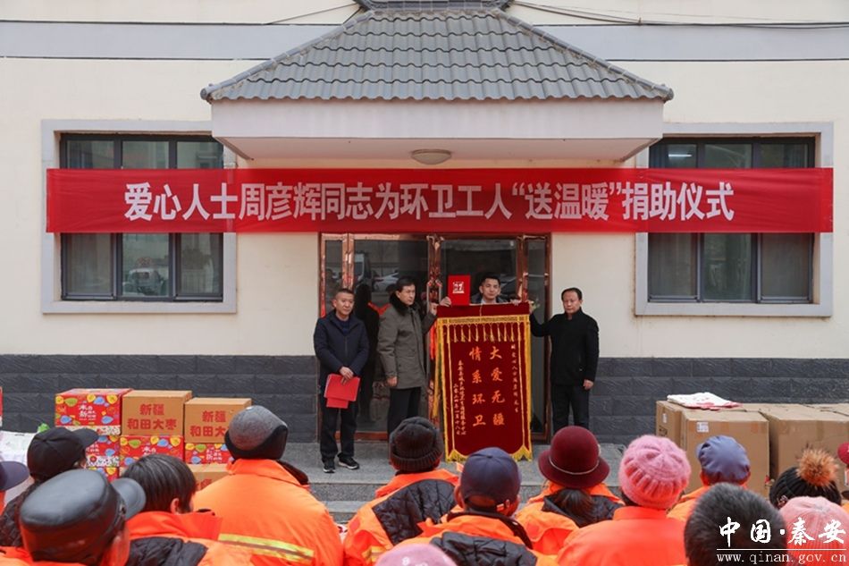入冬以来,气温持续走低,但环卫工人仍坚守在自己的工作岗位,为感谢环卫工人的辛苦付出,1月18日,秦安县爱心人士周彦辉为全县一线环卫工人捐赠了价值6万余元的“暖冬礼包”,向辛勤的“城市美容师”致谢、致敬。