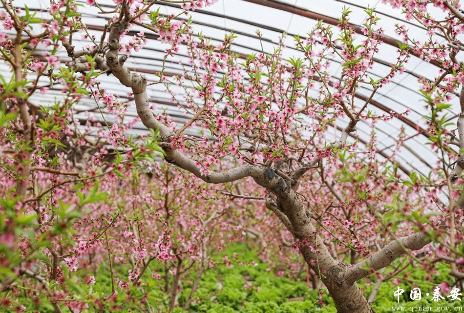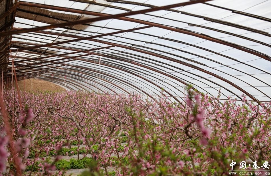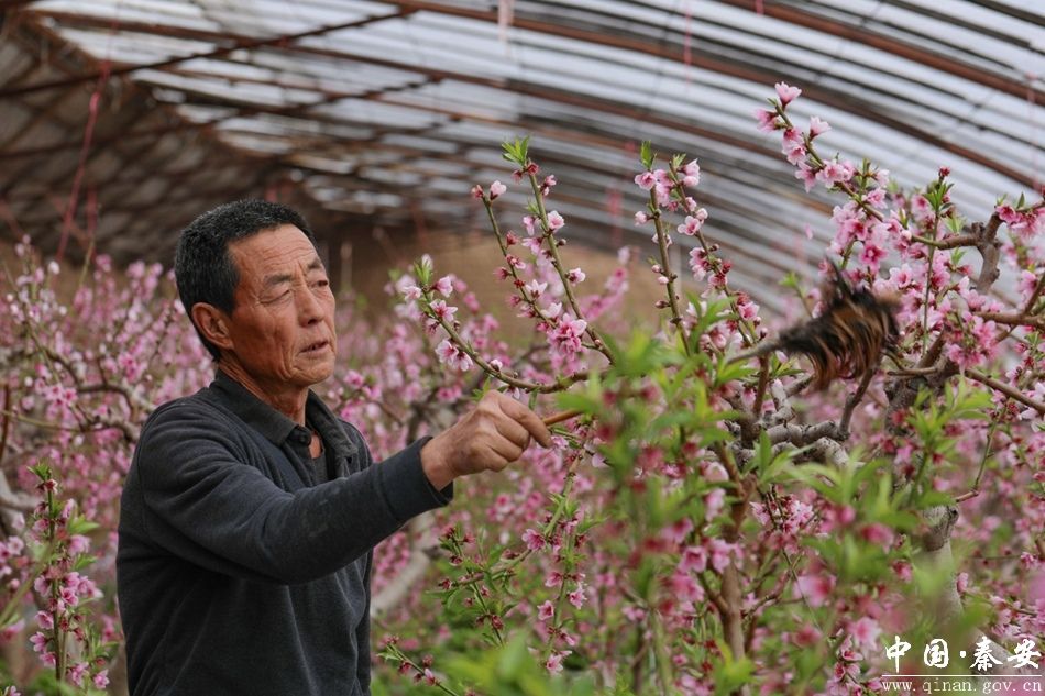 大棚里,蔡永忠正忙着给桃树疏花、授粉,1米多高的油桃树上桃花竞相开放,争奇斗艳。放眼望去,有的花含苞待放;有的花瓣舒展,尽情吐露着花芯;有的花娇羞地低着头;有的花簇拥在一起如同花球一般,香气扑鼻。沁人心脾的花香再配以满眼粉嫩的桃花,让人有一种错入桃源的感觉,室外耀眼的阳光透过大棚洒在花瓣上,将粉嫩的花朵映衬得更加鲜艳欲滴,显现出一幅人面桃花相映红的怡然景色。