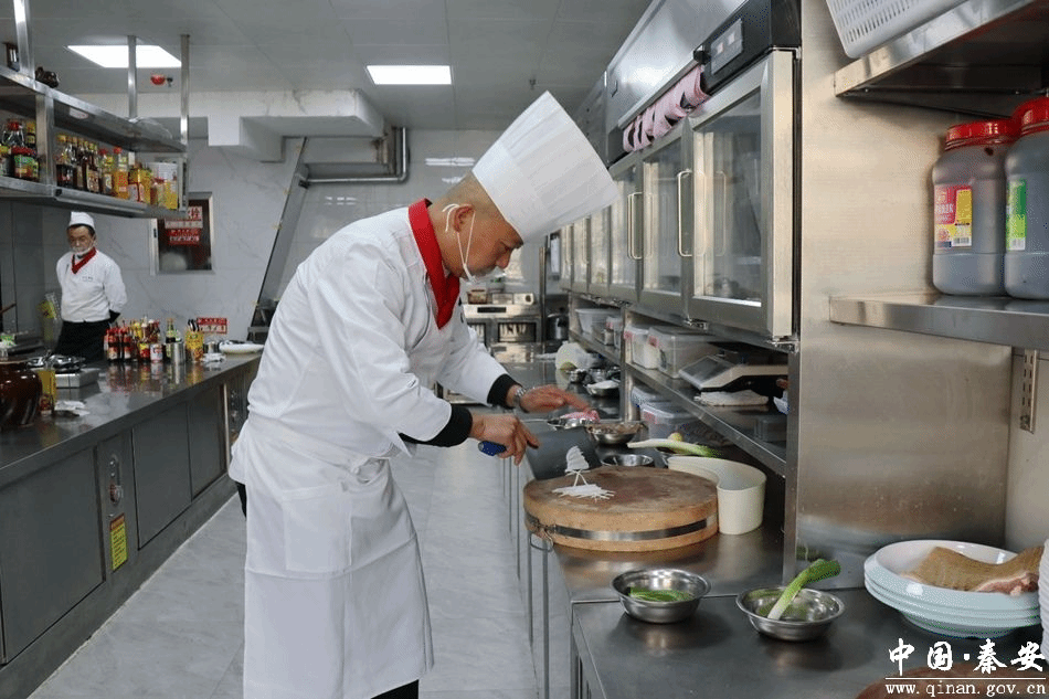 在成纪宴府的后厨里,宋厨师长正忙得不亦乐乎,制作这道传统名菜。他将提前准备好的食材摆在灶台上,提起刀,集中精神,手腕灵活地带动刀上下移动,刀与菜的交响曲便在厨房中悠然绽放,交织出一段段美妙的协奏曲。不一会儿,猪肚、生姜、葱、玉兰片等食材就变成了粗细均匀的丝,一一被盛放在碗里备用。