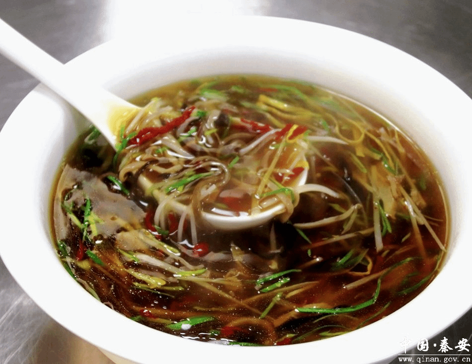 酸辣肚丝汤之于秦安,就像火锅之于四川,酸辣肚丝汤之于秦安人,譬如牛肉面之于兰州人,小饭之于张掖人,糊锅之于酒泉人,那种故土般悠长的滋味已经融入了当地人的血脉之中。一道酸辣肚丝汤,传承了大地湾先民的食俗文化,兼容了川人晋人的酸辣口味,犹如盛开在秦安人味蕾上的绚烂花瓣,沉淀成天水人腹腔中的相思记忆,浓郁厚重的美食味道,绵延相传,从远古一路飘香,传承至今。