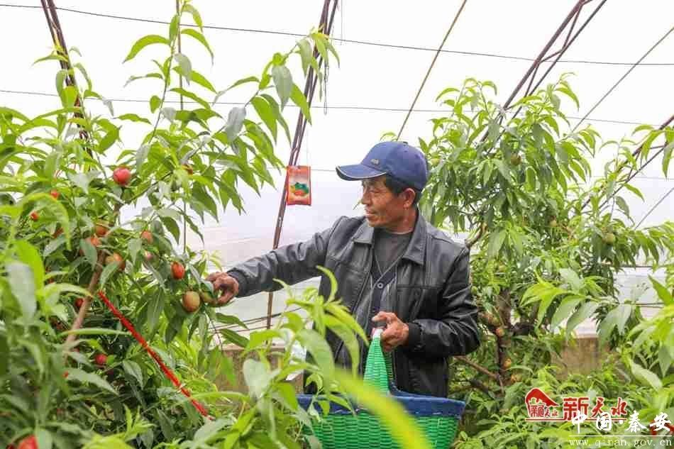 新天水讯【通讯员张黎明 董国庆 李鹏娟】人勤收获喜,硕果满枝头。近日,笔者在秦安县刘坪镇杜寨村杜金录家的大棚内看到,在一片片翠绿色的枝叶当中,一颗颗红色泛着光泽的桃子点缀其中,让人看了赏心悦目,红彤彤的油桃鲜嫩饱满,熟透的果实令人垂涎欲滴。