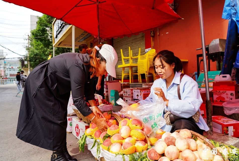 在秦安县夜市一条街上走过,一筐筐鲜嫩的桃子整齐地摆放着,浓郁的桃香扑鼻而来,吸引了不少市民购买尝鲜。
