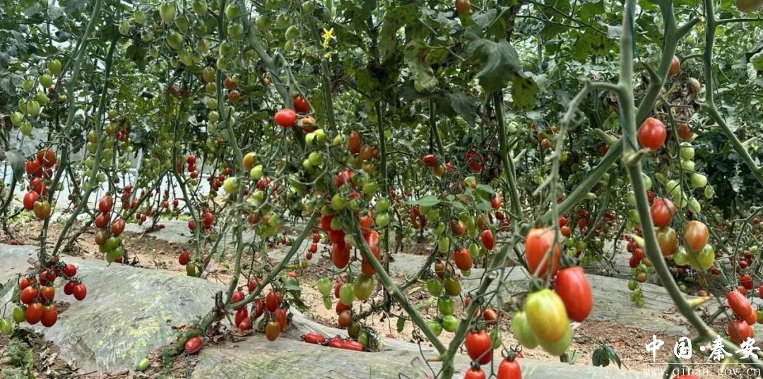 在成县尹寨村现代蔬菜产业园的温室大棚内,一排排番茄藤整齐地遍布在大棚内,翠绿的枝叶间悬挂着一串串“五彩宝石”,散发着浓郁的果香。