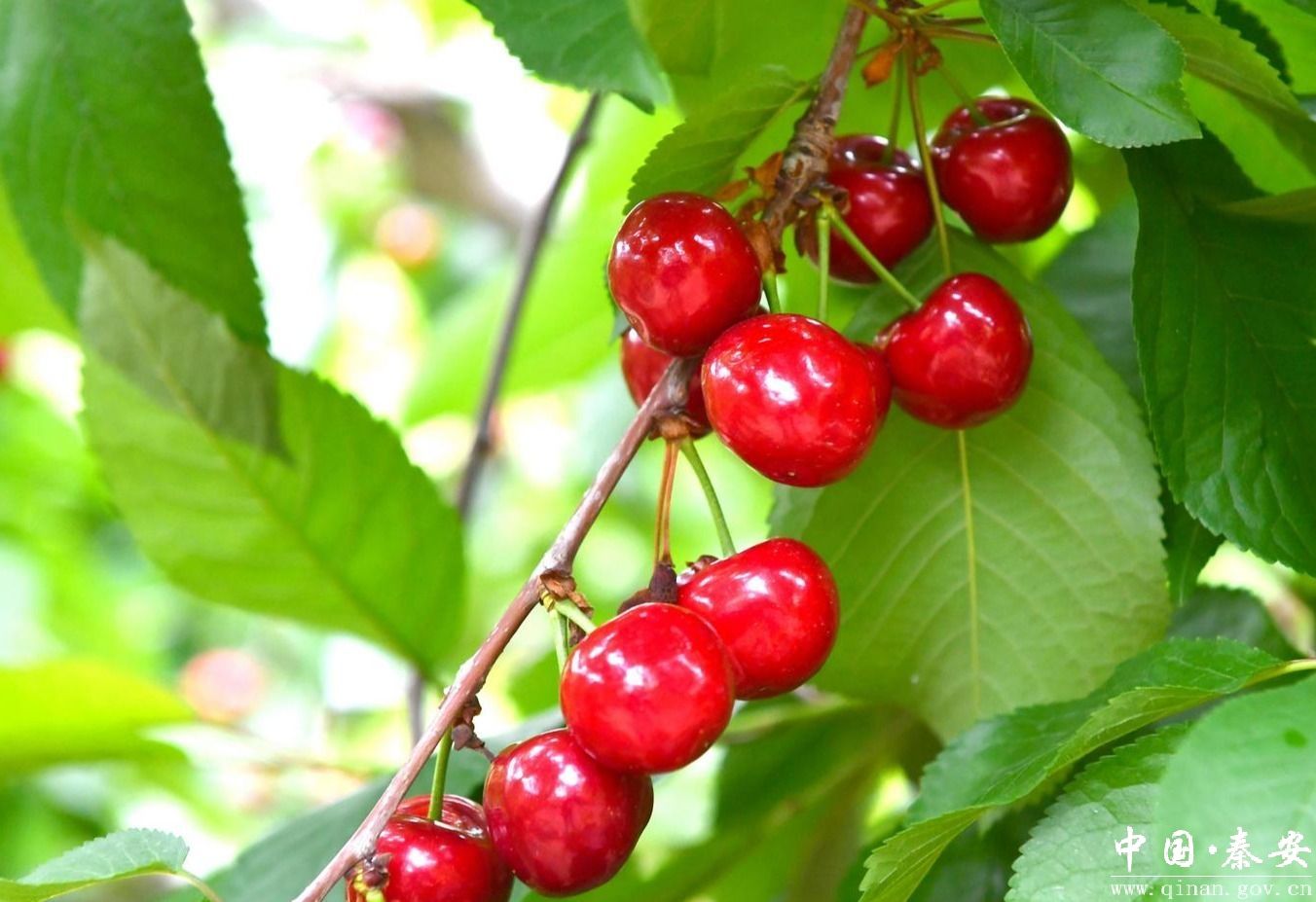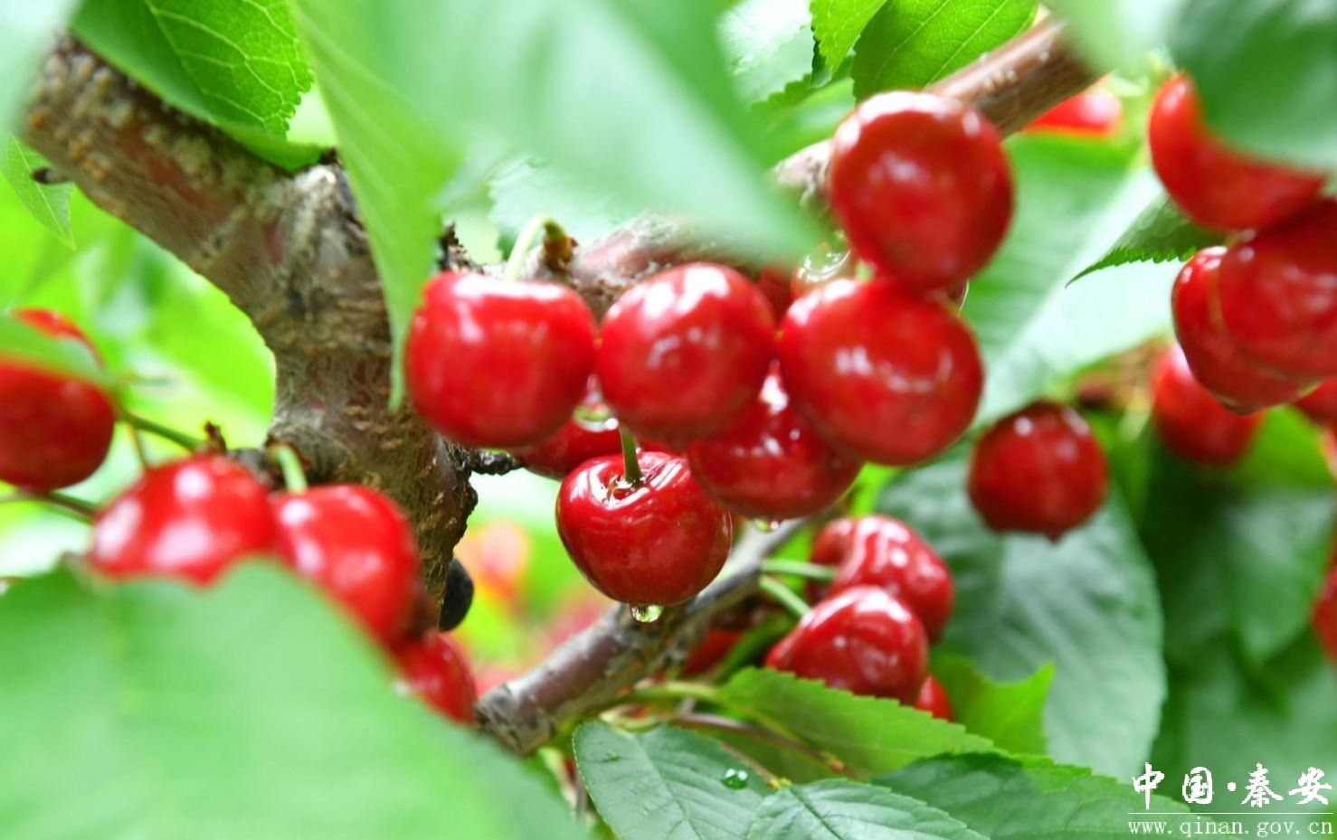 天水市秦州区中梁镇红卫村滴水崖自然村的樱桃种植园里,成熟的大樱桃挂满了枝头,红彤彤的果实,分外喜人。(周文涛 摄)