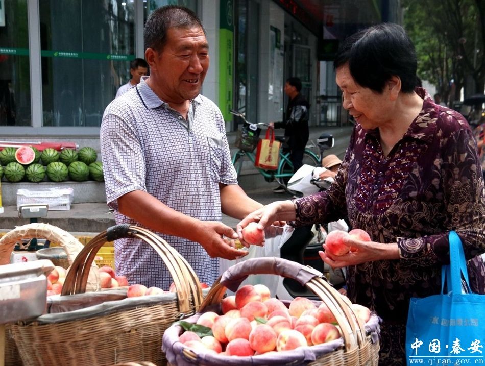 在秦安,像白舲这样的零售摊点还有很多。刘坪镇周家堡子的周茂子就是如此,他的7亩果园全部种植了蜜桃,每天清晨,他都会骑着三轮车前往果园采摘新鲜蜜桃,根据蜜桃的成色和品质进行分类,然后拉到县城销售。‘先尝后买’是他一贯的叫卖手段,不一会儿的工夫,他的摊位前就围满了人,大家争相购买老周的蜜桃,都想尝尝这早市上的新鲜美味。