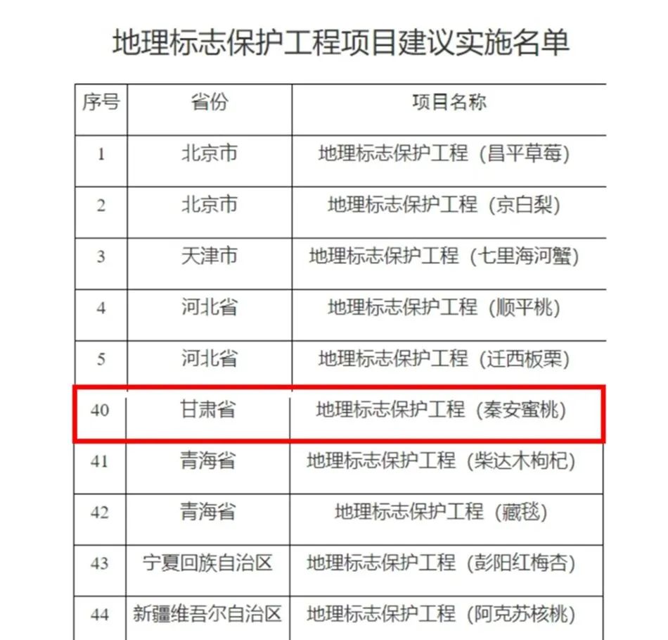 日前,国家知识产权局办公室发布《关于2024年地理标志保护工程实施名单的公示》,经省级知识产权局审核推荐,国家知识产权局对申报推荐名单进行综合评审,拟定2024年地理标志保护工程实施名单。其中《秦安蜜桃》榜上有名,是甘肃省唯一入选项目。