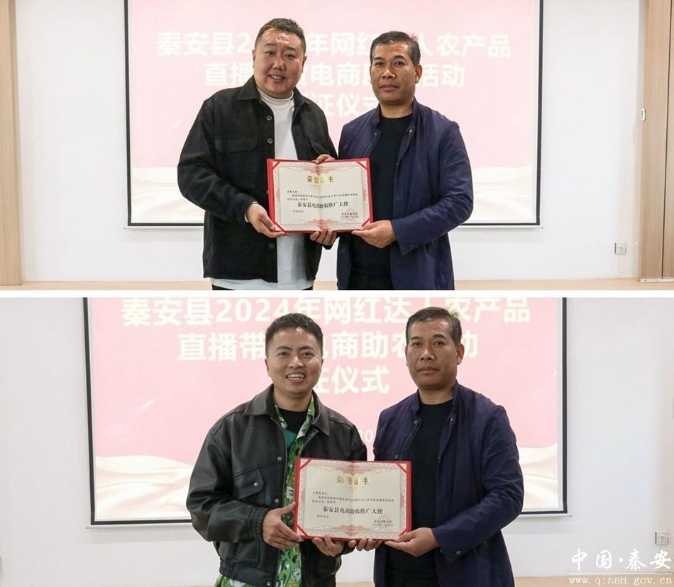 当天,在刘坪镇电商直播中心,秦安县商务局还为“老姜夫妇”“大眼吃遍天”颁授了“秦安县电商助农推广大使”证书。