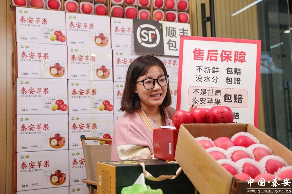 在秦安县郭嘉镇电商中心,主播正在介绍秦安苹果。自9月初苹果开始售卖截止至今郭嘉镇电商中心线上销售单量一万余单 ,销售金额50余万元 ,线下零售 、商超供货10万斤 ,共计收入100余万元。