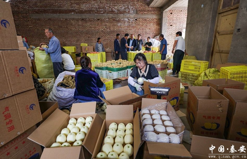 在秦安县五营镇闫家沟农业专业合作社冒冒粮苹果生产基地,红彤彤的苹果挂满枝头,工人们正忙着采摘、分拣、包装,果园里一片繁忙景象。