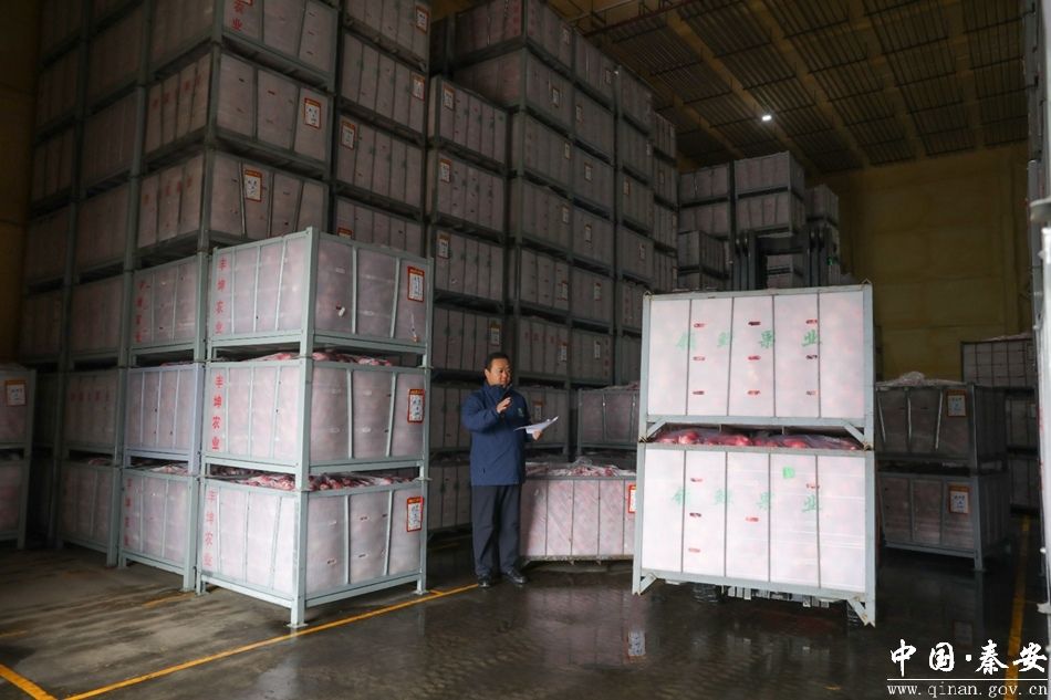 在秦安县魏店镇贵园宏果业,从各个代收点往来运输苹果的车辆络绎不绝,叉车不停地取下打包好的苹果包装箱,贴上标签后入库冷藏。
