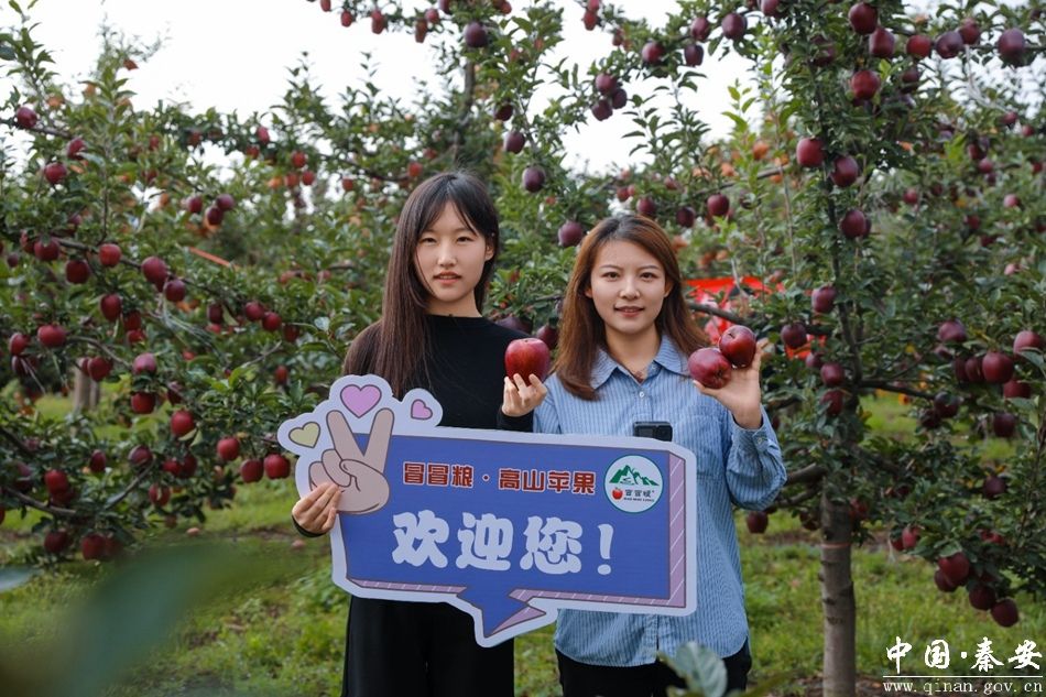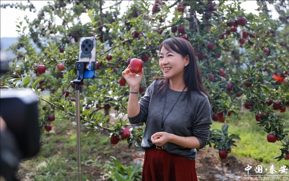 在秦安县五营镇闫家沟农业专业合作社, 秦安县融媒体中心组织的媒体记者和县内网红达人赴开展“媒体组团进果园 直播助农促增收”活动。通过媒体力量宣传推介秦安苹果,帮助果农拓宽销售渠道,助力群众增收。