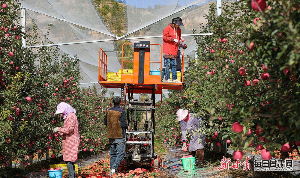金秋十月,正是苹果丰收的季节。10月24日,在秦安县五营镇绿野种植专业合作社的苹果基地,300亩红富士苹果进入采摘期,果农们正忙着采摘、分拣、装筐,呈现出一派繁忙而有序的丰收景象。果园里,一台台苹果平台车在果树间穿梭,这些平台车设计精巧,操作灵活,可根据果树的高度和采摘人员的需求进行自由升降和移动。采摘人员站在平台车上,能够轻松地摘到高处的苹果,大大提高了采摘效率,确保了苹果的高品质上市。