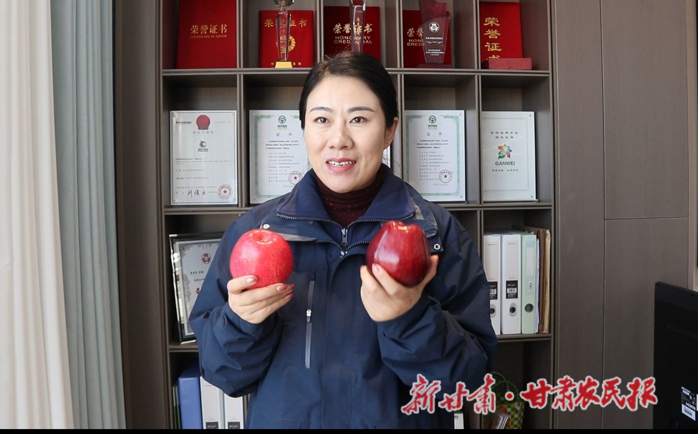 为了让家乡的苹果产得足、销得旺,董晓梅花费了很多心思。从开始学种苹果做起,组建技术服务与生产托管团队,指导果农应用现代果园管理技术、果园机械化作业托管,到打造以苹果、蜜桃生产、收购、储藏、加工、销售为一条龙的秦安县领鲜果业农民专业合作社,再到在广州、成都、贵阳等7个城市建立销售分公司,带着自己种植的天水“花牛”苹果登上CCTV-3综艺频道《幸福帐单》,她用十年的时间,让家乡的苹果切实成为了父老乡亲增收致富的“金果果”,成为了宣传推介家乡的靓丽名片。