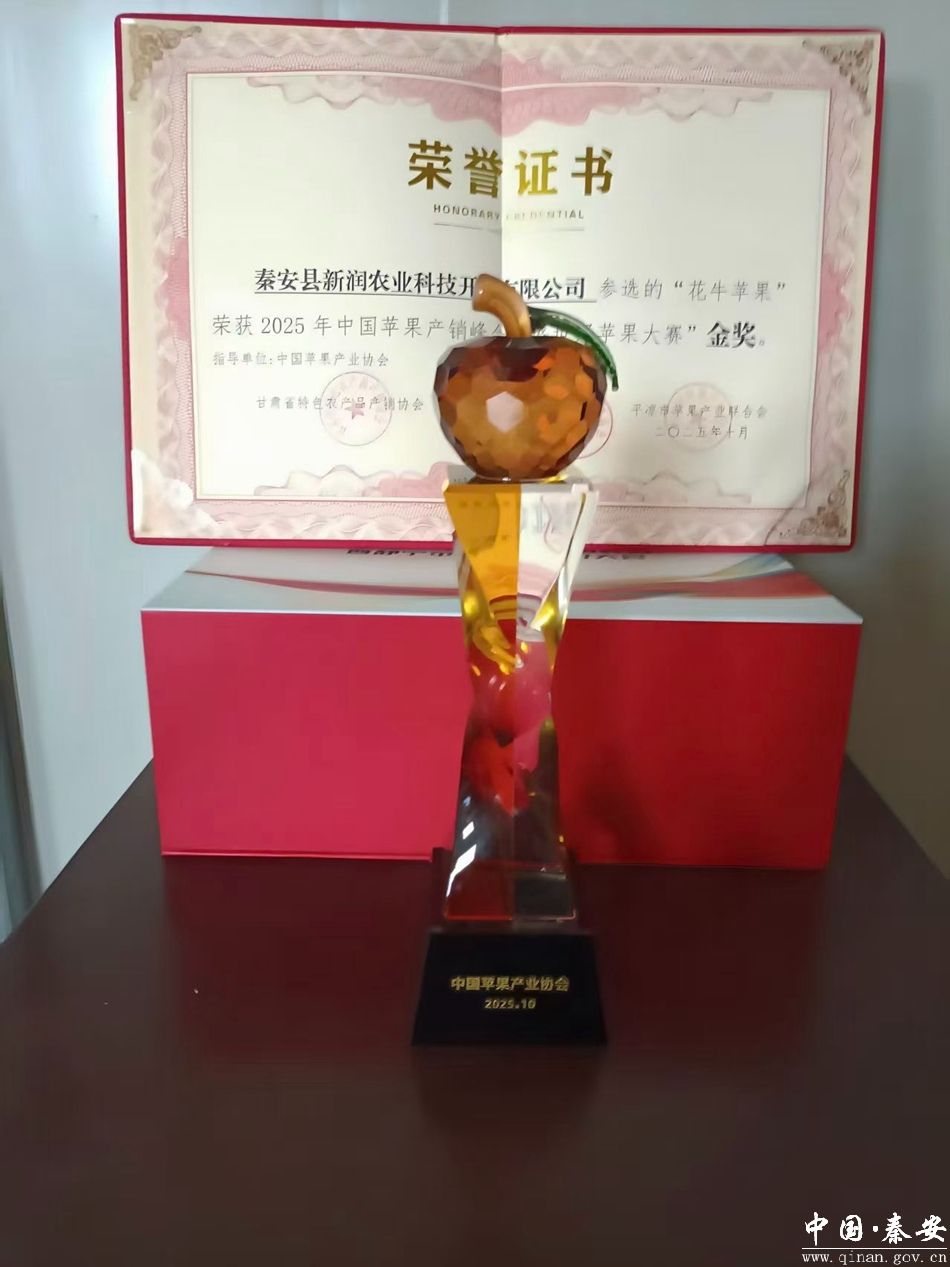 近日,在甘肃平凉举办的2025年中国苹果产销峰会暨静宁苹果招商推介大会上,由省级龙头企业——天水市秦安县新润农业科技开发有限公司选送的花牛苹果荣获“盛世好苹果金奖”。