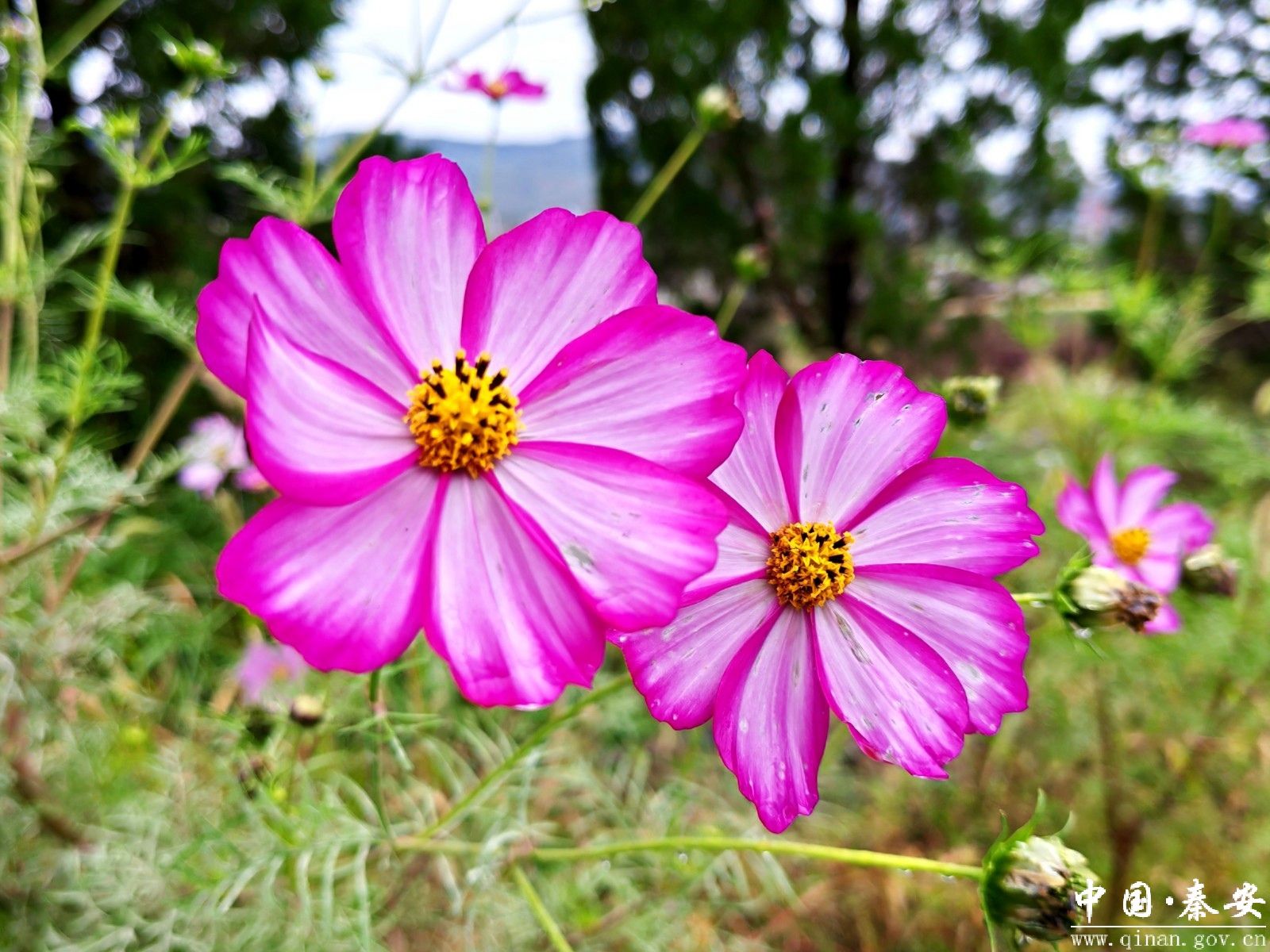 城郊及乡村的秋景更是美不胜收。城郊一处角落里,一枝枝、一簇簇八瓣梅正迎风绽放着,有淡雅的粉白、娇嫩的粉红,也有明艳的玫红和沉静的淡紫,有时一朵花上还会呈现出渐变的色彩,为秦安的深秋增添了一抹亮丽而温暖的色彩。果园里,一个个苹果缀满枝头,红的似火,黄的如金,与绿叶相互映衬,一派丰收的景象。山林间,树木的叶子有的金黄透亮,有的橙红似火,有的仍带着几分未褪的绿意,青、黄、红、橙交织在一起,层层叠叠,如诗如画。