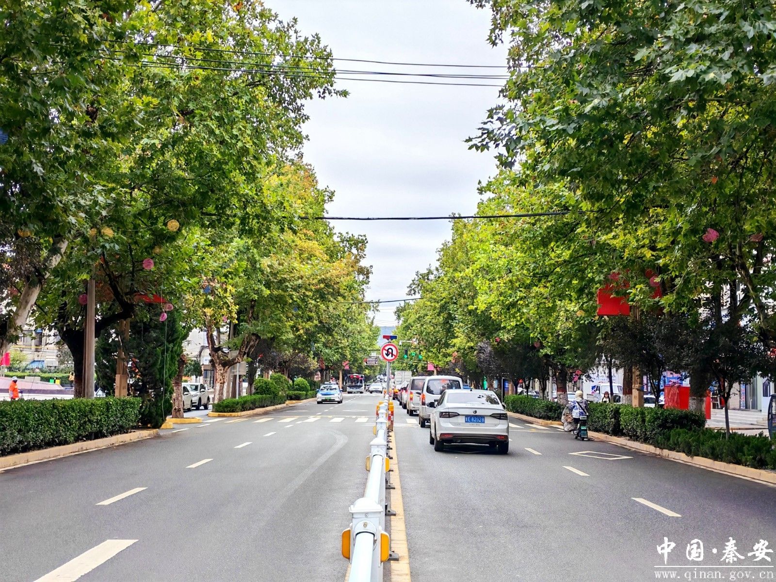 雨后初歇的秦安,秋景愈发清新迷人。漫步在秦安县城的街头巷尾,秋意已渗透到每一个角落。城区主干道两侧,行道树的叶子被雨水冲刷得格外鲜亮,部分叶片已悄悄泛黄,黄绿相间,层次分明。阳光透过枝叶洒下,光影斑驳,为街道增添了几分诗意。