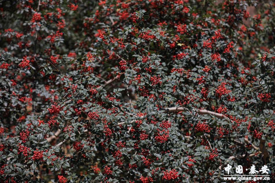 在秦安县王窑镇的道路沿途,无论是山梁上,还是坡沟里,都是绵延连片、红绿叠嶂、硕果累累的花椒,漫山遍野的花椒树被饱满的椒果压弯枝条,挂满枝头的花椒像是被阳光镶上了一层金晕,甚是喜人。花椒地里,正忙着采摘花椒的椒农们个个脸上洋溢着幸福的笑容。