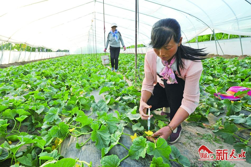 大地家园果蔬专业合作社的果农在甜瓜大棚务农。