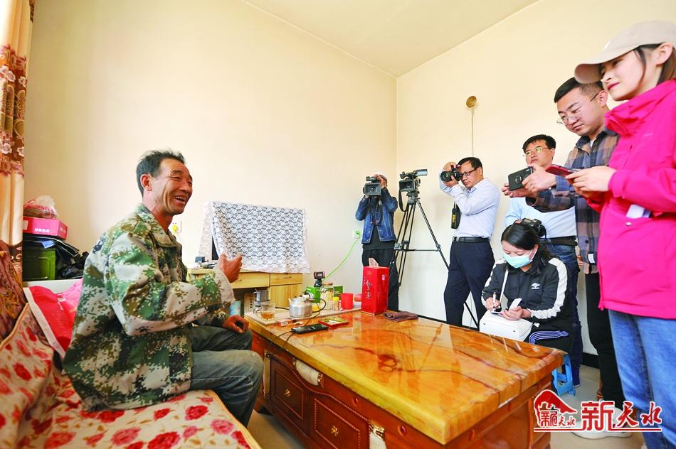 秦安县王铺镇张咀村的张五喜家2019年脱贫,又盖了一院新房,院墙粉刷一新,水泥地面平整,屋里茶几上的罐罐茶炉冒着热气。他坐在沙发上向记者们讲述着自己脱贫前后的家境。