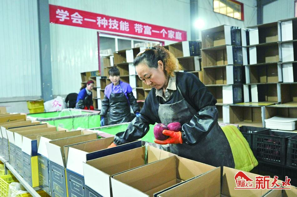 雪原果品公司扶贫车间的工作人员在分拣苹果。