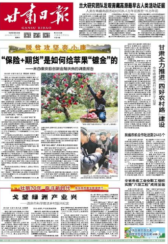 中国太平洋财产保险股份有限公司甘肃分公司联合宏源、申银万国、东证、渤海、华泰、华龙6家期货公司,将苹果“保险+期货”项目覆盖到秦安县建档立卡贫困户中的所有苹果种植户,惠及全县17个乡镇4400户农户,承保苹果8880吨,总保额1亿余元。