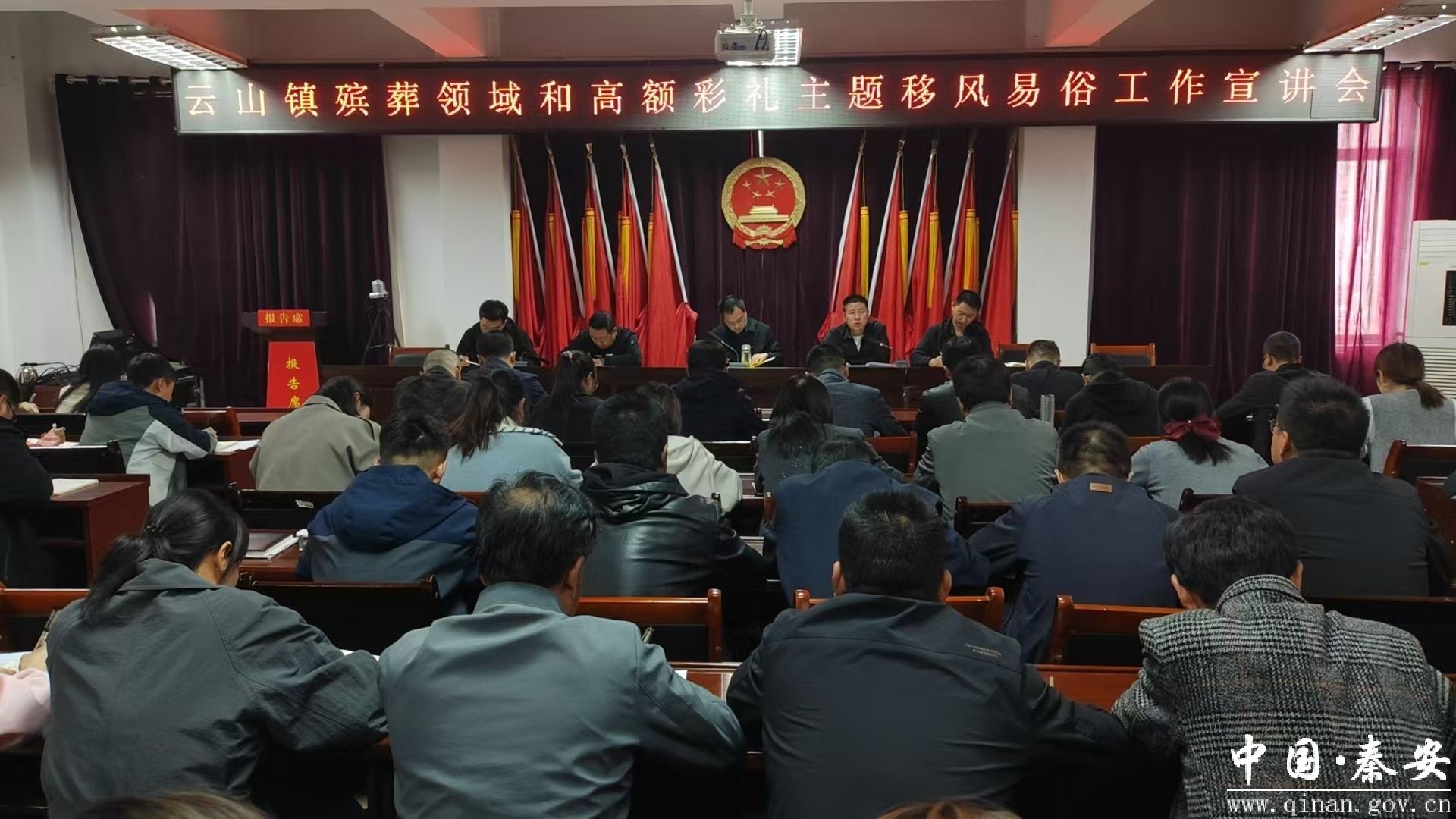 近日,秦安县云山镇组织召开殡葬领域和高额彩礼主题移风易俗工作宣讲会,全面推进乡风文明建设,引导群众摒弃陈规陋习,树立文明新风尚。镇村干部、红白理事会成员、村民代表等100余人参加此次会议。