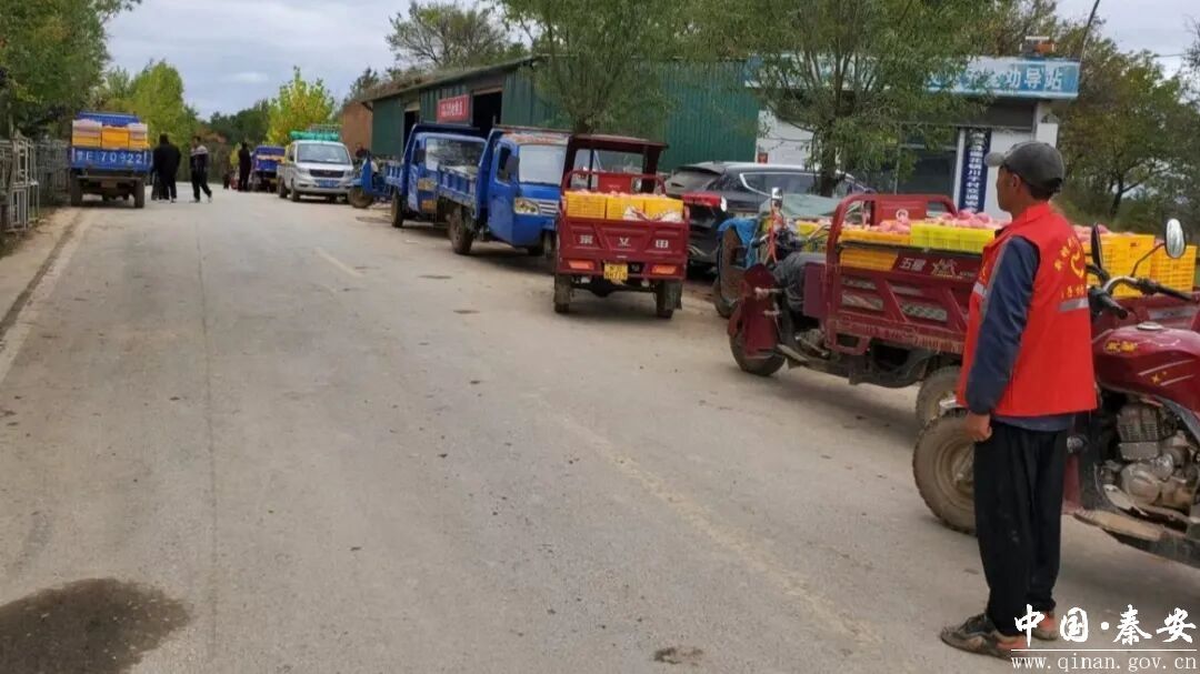 此外,针对苹果采收季车流、人流量大,镇村主干道上收购商车辆、果农运输车辆集中,常出现拥堵的情况,莲花镇组织志愿者每天在重要路段、路口执勤,引导车辆有序停放、错峰通行。并在拥堵路段设置临时指示牌,告知收购商和果农存储点、交易市场的具体位置,切实维护交通秩序。