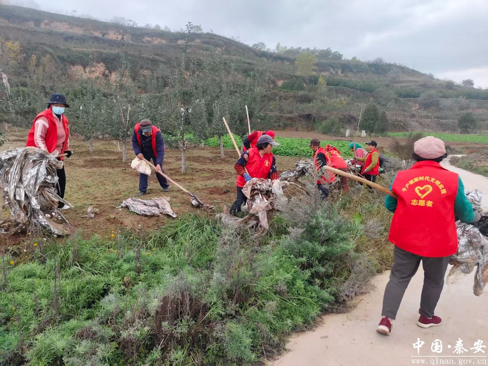 聚焦重点压责任。千户镇压实镇、村、组三级主体责任,由党支部牵头统筹,构建“干部带头、志愿者助力、群众参与”的工作机制,将任务细化到网格、落实到个人,确保整治无死角。在清理现场,党员干部挥耙子清理农田地膜,公益性岗位人员用夹子捡拾果袋,志愿者参与清理反光膜,大家分工协作,干劲十足。